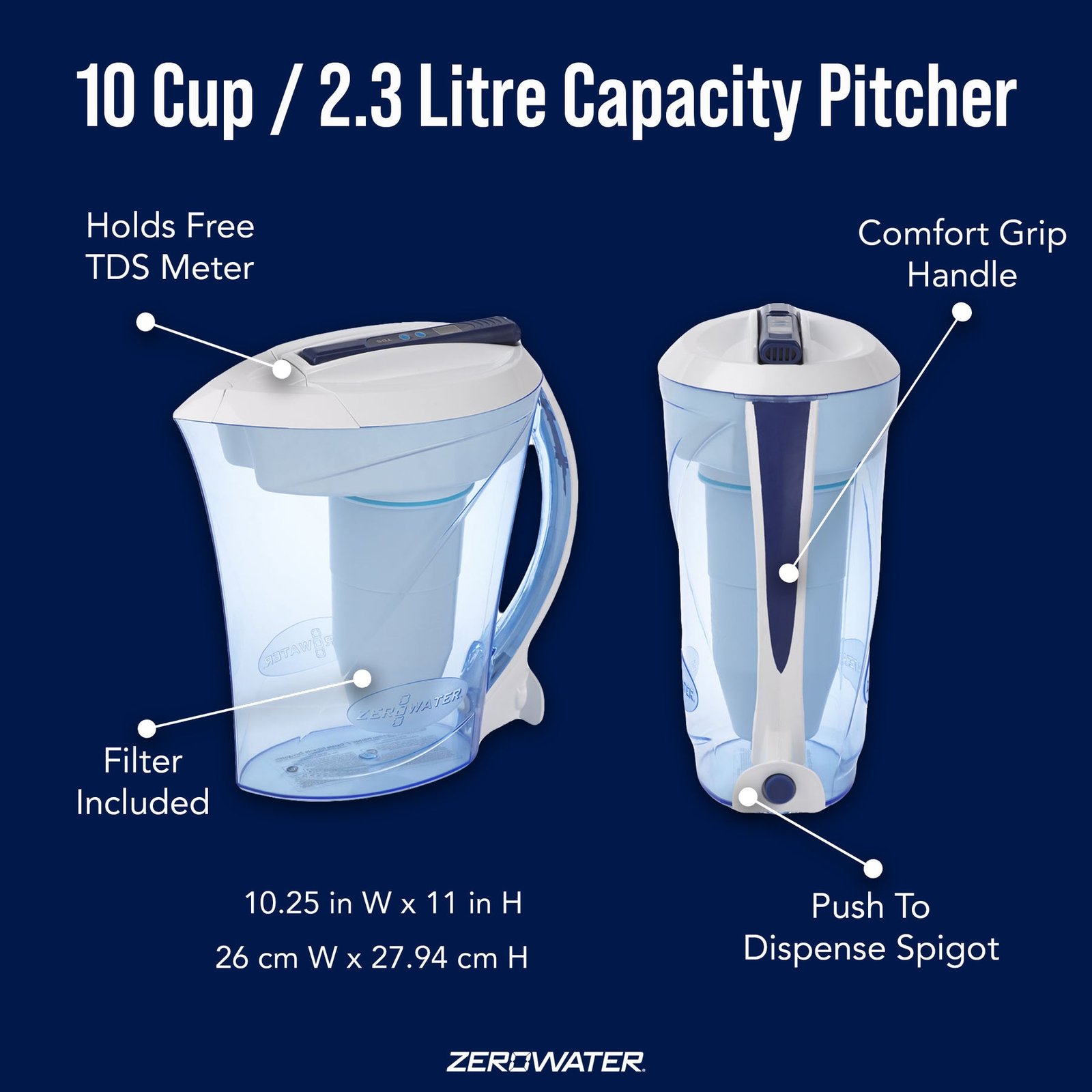 ZeroWater 2.4L 10-Cup Filter Jug with 5-Stage Filtration and TDS Meter for Pure Drinking Water